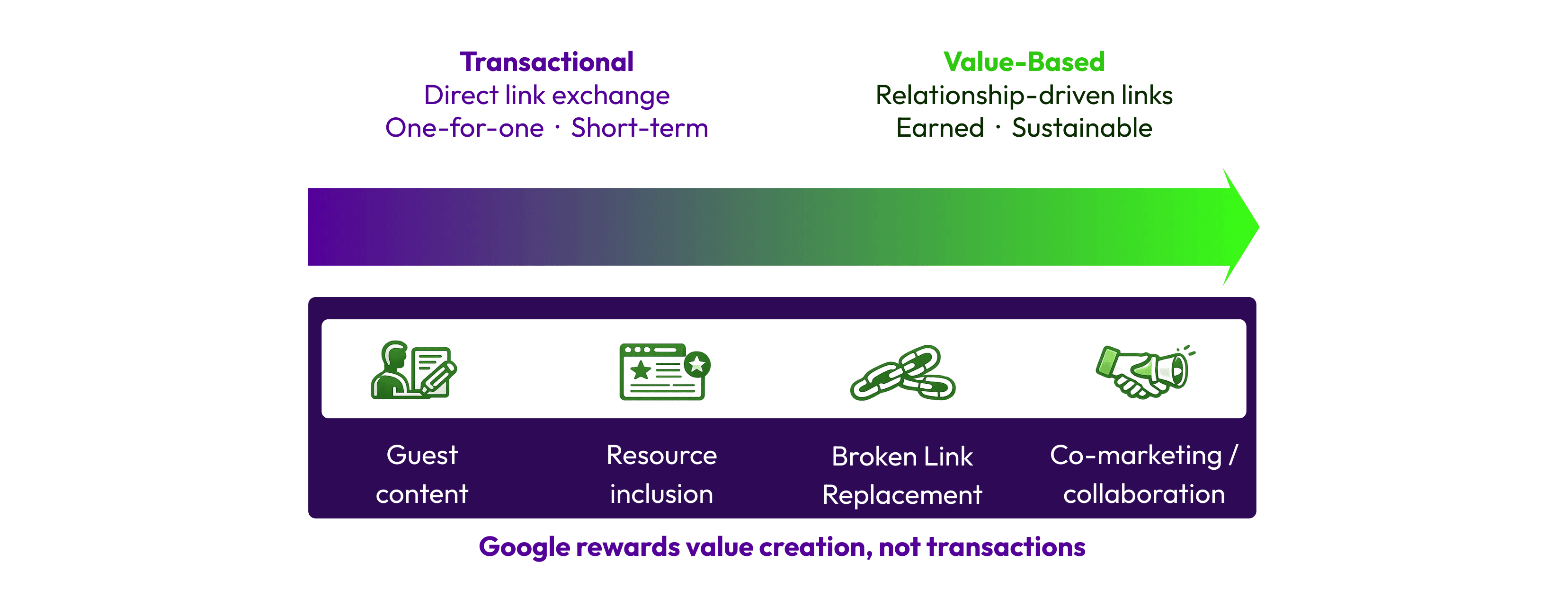 These broader approaches result in more sustainable, impactful links because they are rooted in genuine value creation rather than transactional link exchanges.