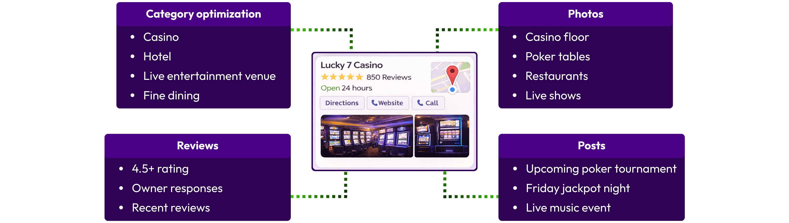 - Choose the right categories. Go beyond “Casino.” Add layers like “Hotel,” “Live entertainment venue,” or “Fine dining.”