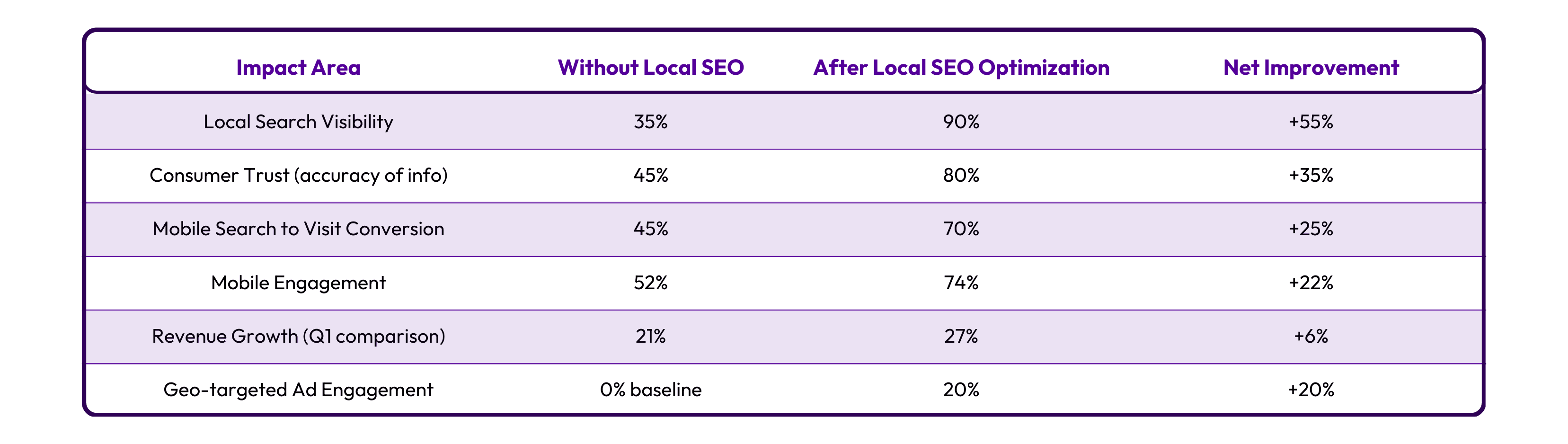 This visualization demonstrates how implementing structured local SEO efforts, such as NAP consistency, Google Business Profile optimization, and geo-targeting, results in notable increases across visibility, trust, and revenue.