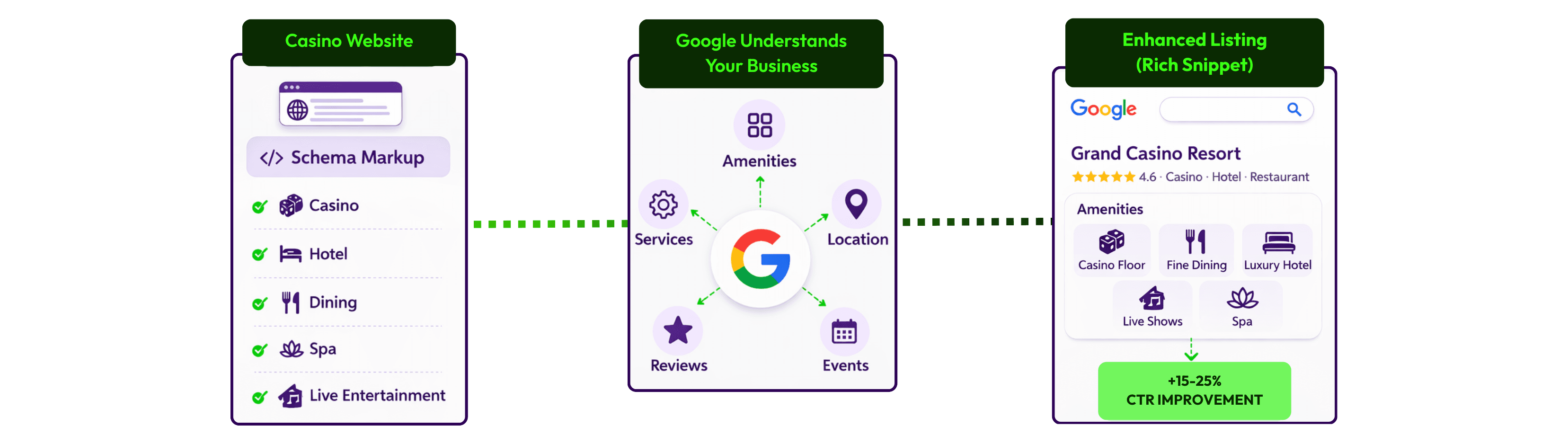 Tag each part of your casino (gaming, dining, hotel, spa, or theater) with proper local business schema. When search engines understand what each section is, your brand earns rich snippets those beautiful enhanced listings that stand out visually.