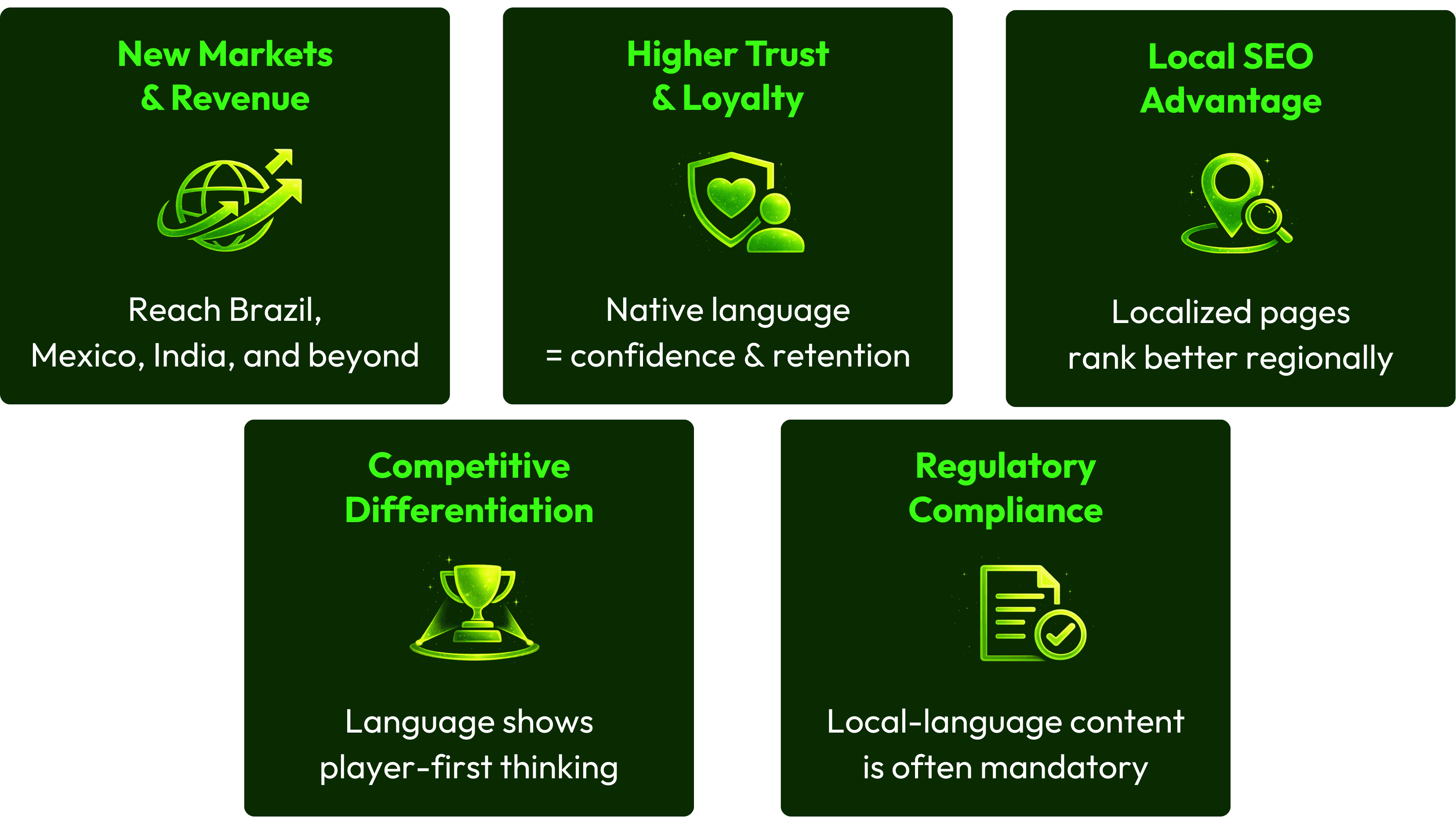- Unlock New Markets and Revenue Streams: Localizing content into languages such as Spanish, Portuguese, or Hindi allows you to tap into thriving regions where iGaming continues to expand.