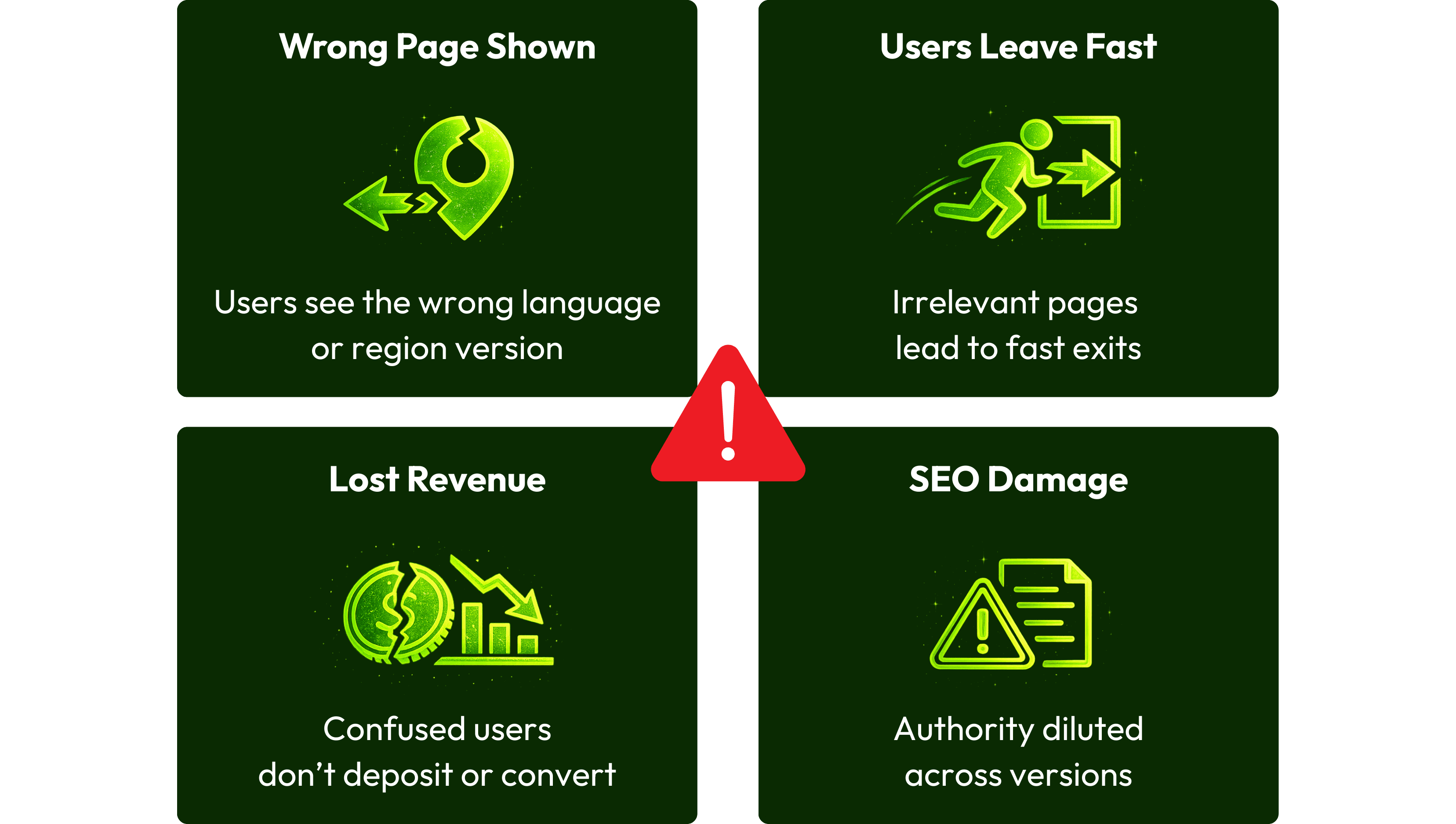 Failing to implement hreflang tags properly can result in significant drawbacks: