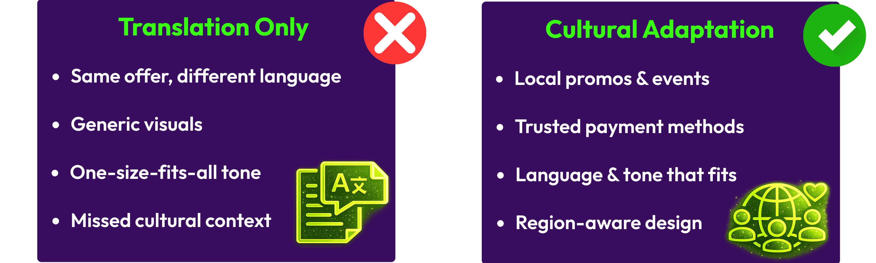 While accurate translation is important, building a culturally resonant experience goes far deeper. Cultural adaptation ensures your platform feels intentionally designed for users in each market, creating trust and engagement.