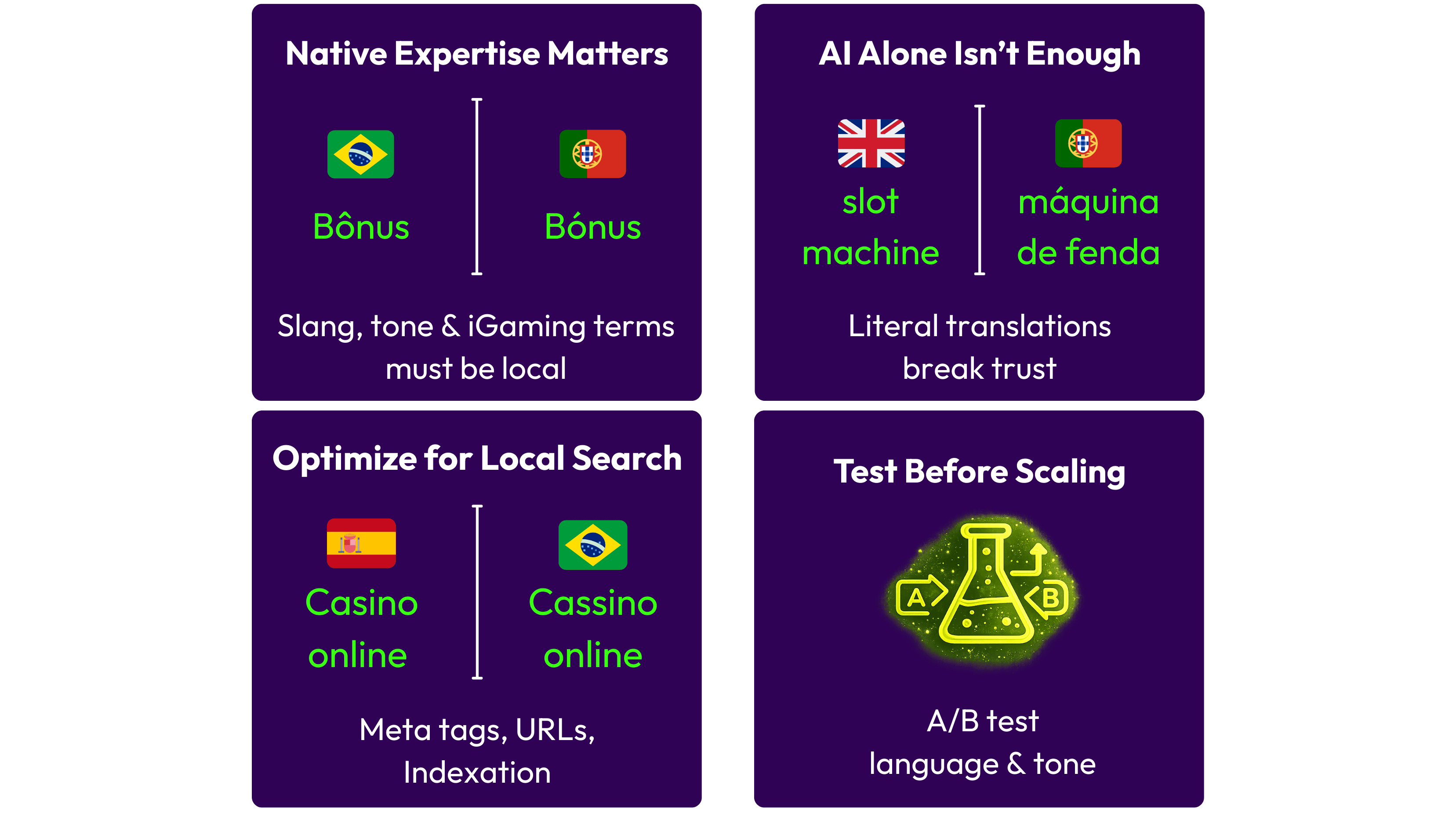 - Work with Native Experts: Engage professional translators familiar with iGaming terminology and local slang. For example, in Brazil, "bônus" is used, while in Portugal, it’s "bónus." Even small differences matter.